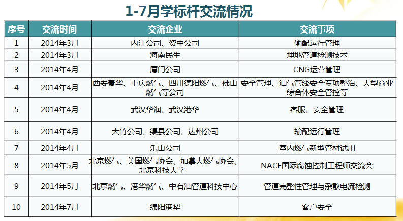 2014年上半年,根據(jù)集團(tuán)學(xué)標(biāo)桿交流相關(guān)工作要求,公司開展多形式學(xué)標(biāo)桿交流10次。